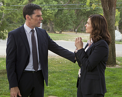 “The Silencer” –Hotch (Thomas Gibson) and newest BAU member Alex Blake (Jeanne Tripplehorn) talk as they investigate the murder of a victim with the trademark handiwork of the UnSub “The Silencer,” who leaves behind victims with his unique trademark of sewing their mouths shut, on the eighth season premiere of CRIMINAL MINDS, Wednesday, Sept. 26 (9:00-10:00 PM, ET/PT) on the CBS Television Network. Photo: Monty Brinton/CBS © 2012 CBS Broadcasting Inc. All Rights Reserved.
