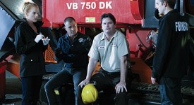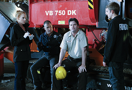“Bump and Grind” — Nick (George Eads, left) and Catherine (Marg Helgenberger, second left) and Greg (Eric Szmanda, right) talk with a plant manager (Matt Mulhern, center) at a shredding factory after the CSI team discover the shredded remains of a man and find themselves with multiple suspects who may be responsible for his death, on CSI: CRIME SCENE INVESTIGATION, Thursday, Nov. 4 (9:00-10:00 PM, ET/PT) on the CBS Television Network.