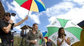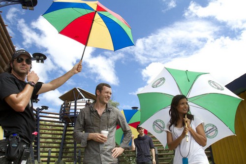 Jason O’Mara and Shelley Conn under umbrellas, one held by 2nd 2nd assistant director Joshua Watkins on a hot and humid day, “Terra Nova” December 9, 2010