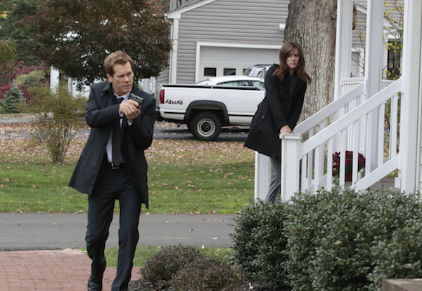 THE FOLLOWING: Ryan (Kevin Bacon, L) and Max (Jessica Stroup, R) follow a lead in the “Home/A Hostile Witness” episode of THE FOLLOWING airing Monday, March 23 (8:00-10:00 PM ET/PT) on FOX. ©2015 Fox Broadcasting Co. CR: Giovanni Rufino/FOX