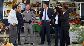 “Ball of Fire” — Special Agent Madeleine Hightower (Anjanue Ellis, right), Senior CBS Agent Teresa Lisbon (Robin Tunney, second right), CBI Agent Wayne Rigsby (Owain Yeoman, center) and Sergeant Delamure (William Francis McGuire, center left) talk with two witnesses who may have seen Patrick Jane shortly before he was kidnapped from a farm stand, on THE MENTALIST, Thursday, Nov. 11 (10:00-11:00 PM, ET/PT) on the CBS Television Network. Photo: Sonja Flemming/CBS ©2010 CBS BROADCASTING INC. All Rights Reserved.