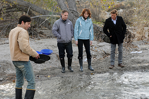 “Red Gold” — CBI Consultant Patrick Jane (right) meets with a modern-day prospector, Wes Attwood (Jordan Belfi, left) and two interested miners, Jack Mitchell (Mark Atteberry, center left) and Sonya Mitchell (Wendy Braun, center right), on THE MENTALIST, Thursday, Feb. 17 (10:00-11:00 PM, ET/PT) on the CBS Television Network. Photo: Michael Yarish/CBS. ©2011 CBS BROADCASTING INC. All Rights Reserved.