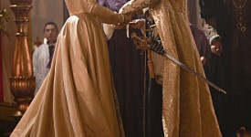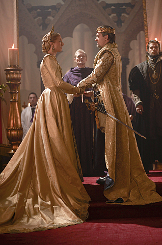Joely Richardson as Catherine Parr and Jonathan Rhys Meyers as Henry VIII (behind) Simon Ward as Bishop Gardiner and Henry Cavill as Charles Brandon (Season 4, episode 7) – Photo: Jonathan Hession/Showtime – Photo ID: tudors_407_1151
