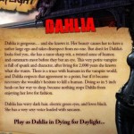 Dying for Daylight è un’avventura grafica con protagonista la vampira Dahlia che porta i giocatori in un epico viaggio attraverso New Orleans, Memphis e Charleston Harbor per trovare una leggendaria pozione che permette ai vampiri di sopravvivere alla luce del sole. Scoprendo che non è l’unica sulle tracce di questo potente tonico, Dahlia deve usare la sua intelligenza contro un una setta di vampiri, cercando di recuperare gli ingredienti dispersi nelle mani dei membri di uno spettacolo circense d’avanguardia, con ogni eclettico membro dello spettacolo in possesso di un pezzo della pozione, Dahlia deve scoprire i loro segreti e procurare la preziosa miscela prima che cada nelle mani sbagliate. Attraverso la raccolta di indizi, risolvendo enigmi e raccogliendo gli ingredienti necessari, i giocatori guideranno Dahlia nella sua missione, trovare la pozione leggendaria prima che sia troppo tardi.